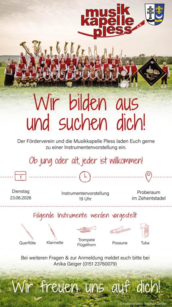 Schön, dass ihr den Weg zu uns gefunden habt – zur Musikkapelle Pless aus dem schönen Unterallgäu. Hier trifft Tradition auf Taktgefühl, Gemeinschaft auf Leidenschaft und Blasmusik auf Herzblut. Nehmt euch Zeit, stöbert durch unsere Seiten und lernt uns und unsere Musik ein bisschen besser kennen. Viel Freude beim Entdecken!